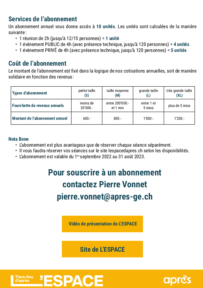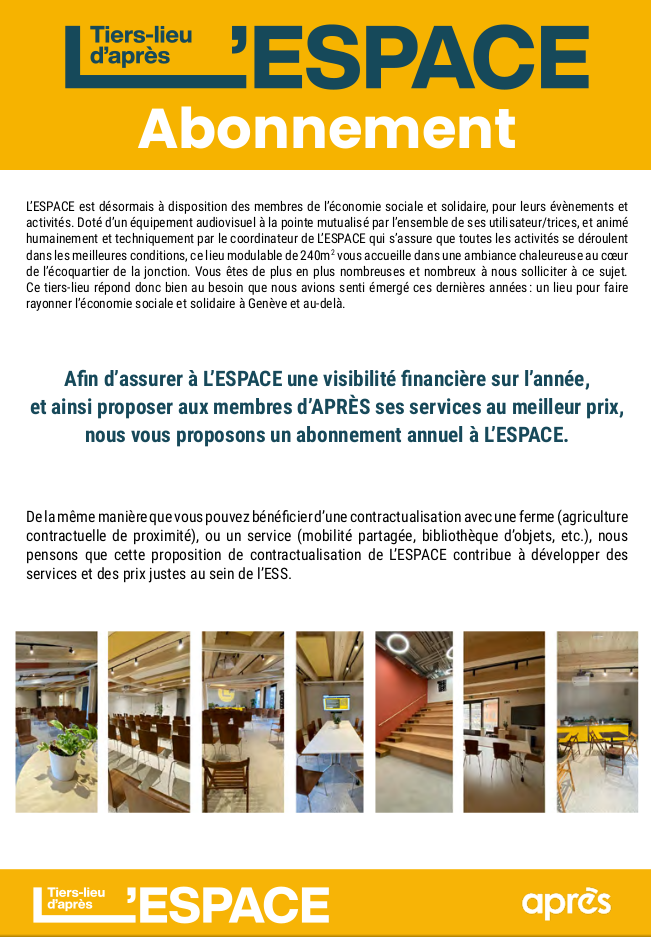 Découvrez l'abonnement "2022-2023" à L'ESPACE, conçu de manière solidaire pour permettre à l'ensemble des organisations et entreprises membres d'APRÈS de pouvoir bénéficier du lieu, à hauteur de leurs moyens.